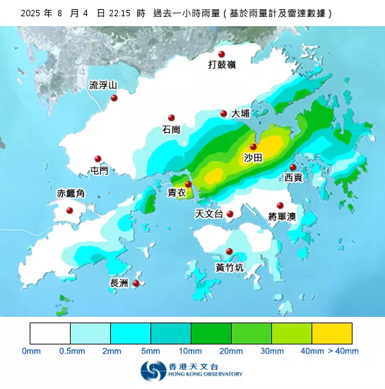 天文台指上述區域已錄得或預料會有每小時雨量超過70毫米的大雨。