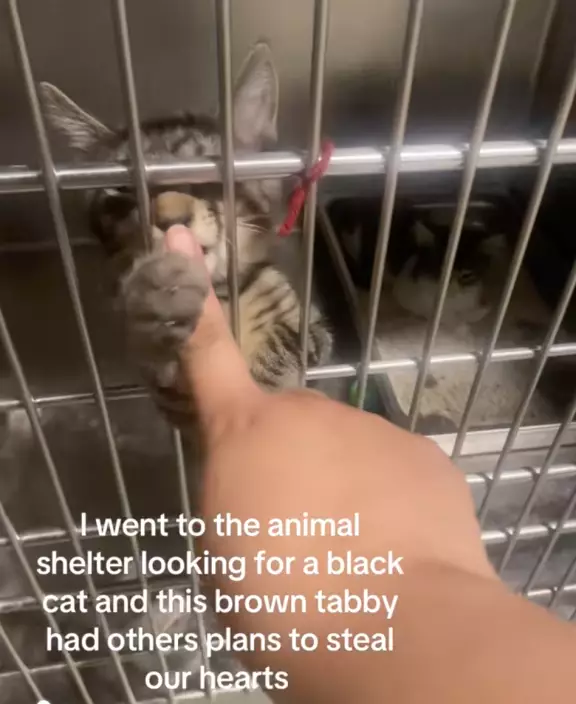 國外一名女子原計劃領養黑貓當寵物,結果在收容所被熱情虎斑貓伸爪撒嬌收服,可愛畫面曝光!