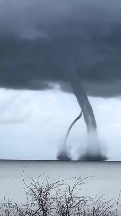 意大利三角洲現雙水龍捲奇觀。影片截圖