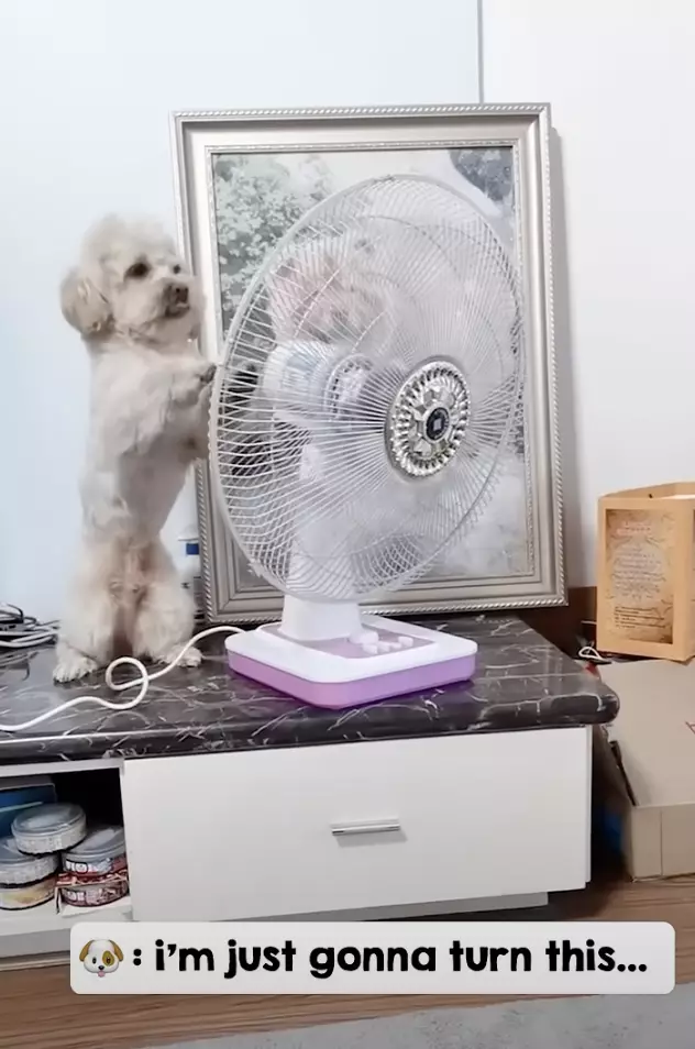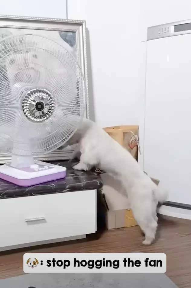 馬爾濟斯熱得忍無可忍,用鼻子頂了頂門溜了出來,走向前方眼神鎖定電風扇。影片截圖