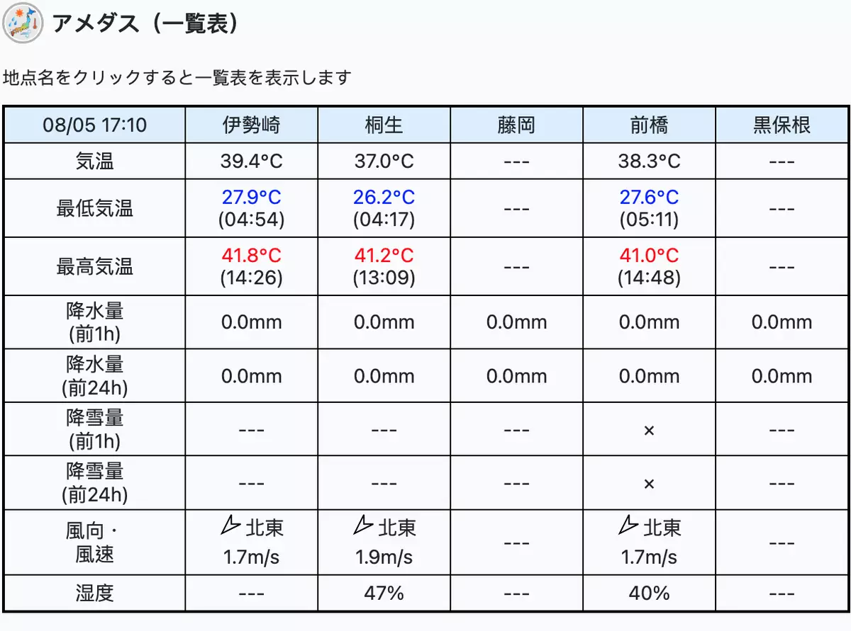 日本氣象廳最初報告伊勢崎市錄到的高溫是41.6度,隨後又更新更高的氣溫。當局呼籲民眾採取措施預防中暑,例如適當使用空調和補充水分。
