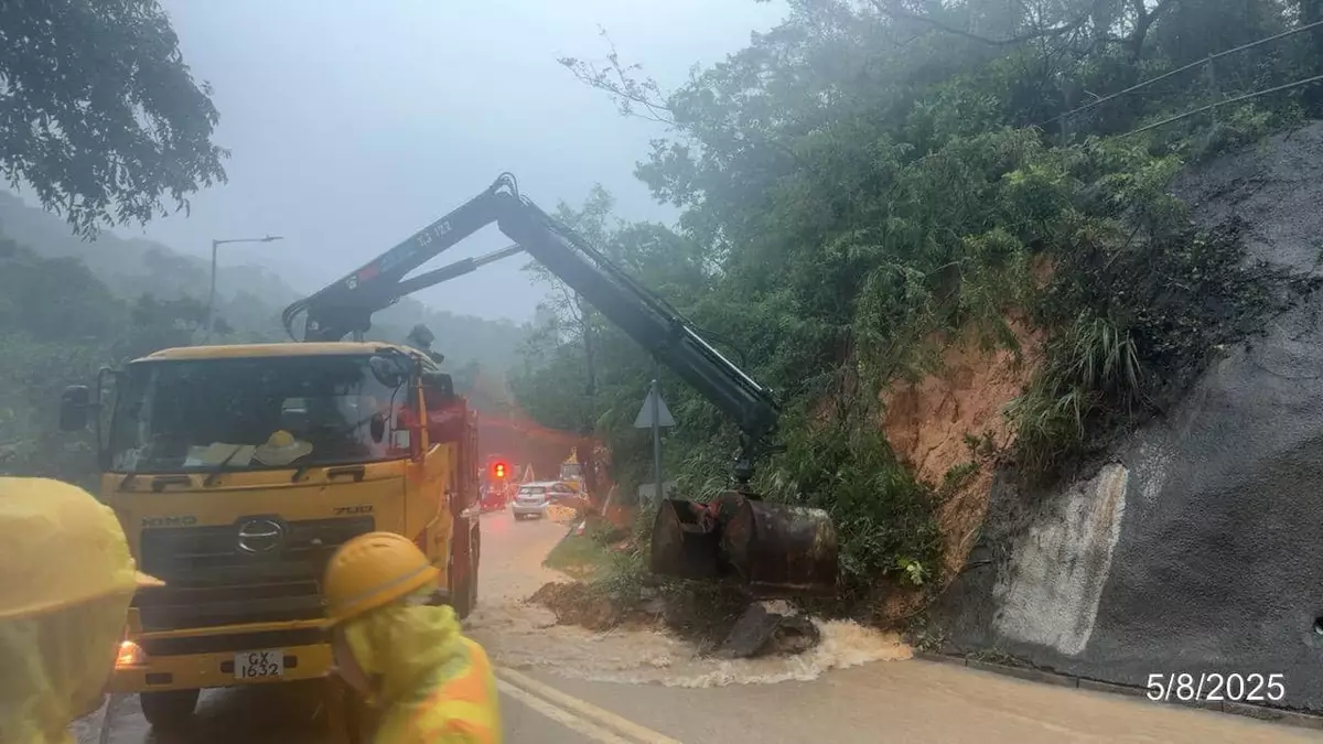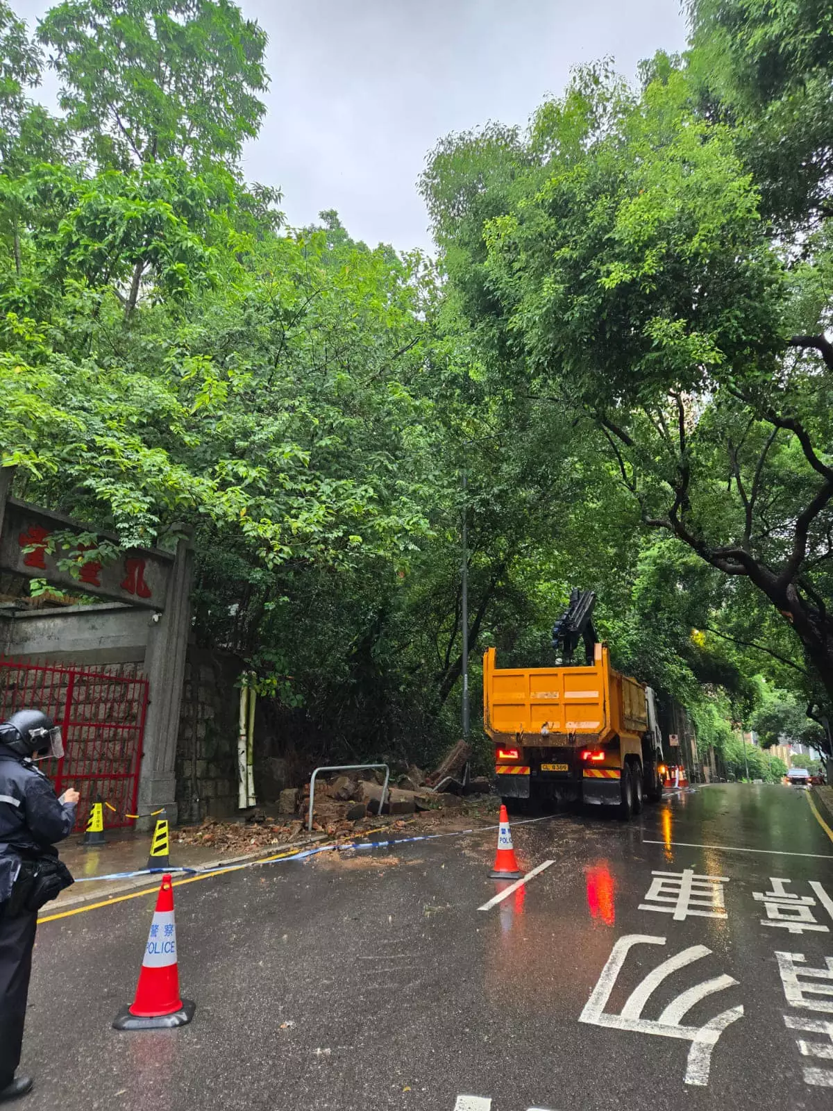 其中在港島的山泥傾瀉現場,有護土牆被山泥衝爛,並壓毀路邊的圍欄,馬路上亦佈滿泥濘和石頭,政府呼籲市民,應遠離斜坡。