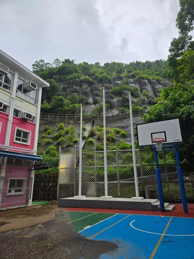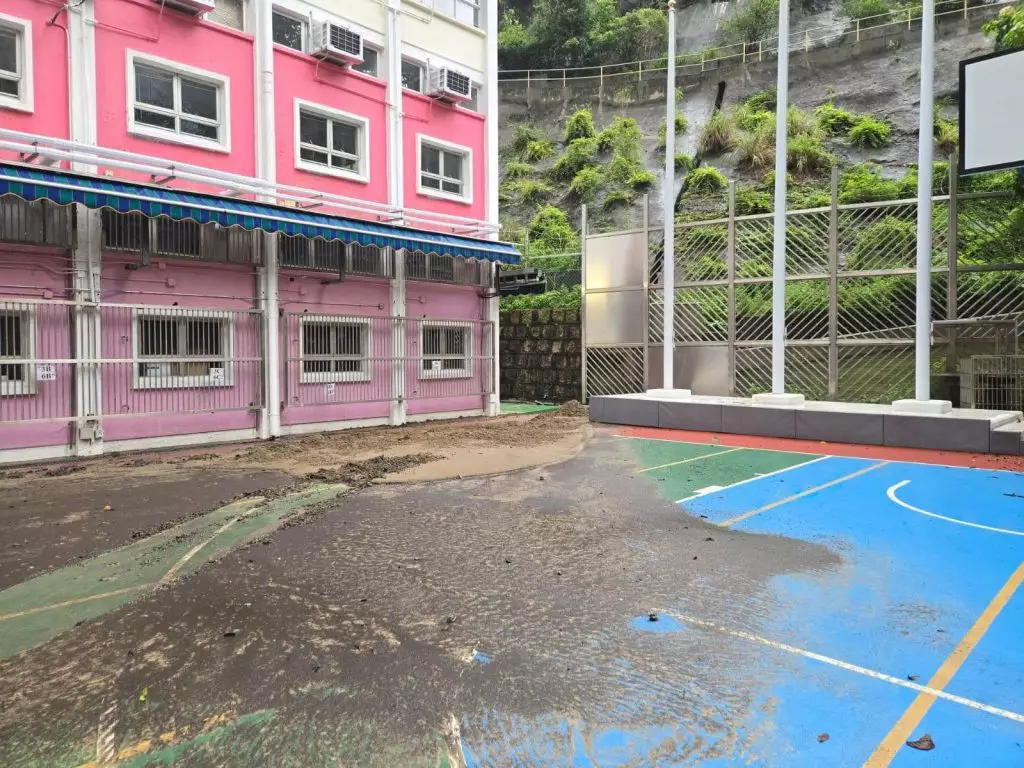 處方在社交專頁說,暴雨期間,大量雨水夾雜沙泥從天然山坡流落人造斜坡,過量沙泥令部分排水渠出現淤塞,引致溢流出現,並湧進學校操場。處方會繼續協助相關維修部門跟進事宜。