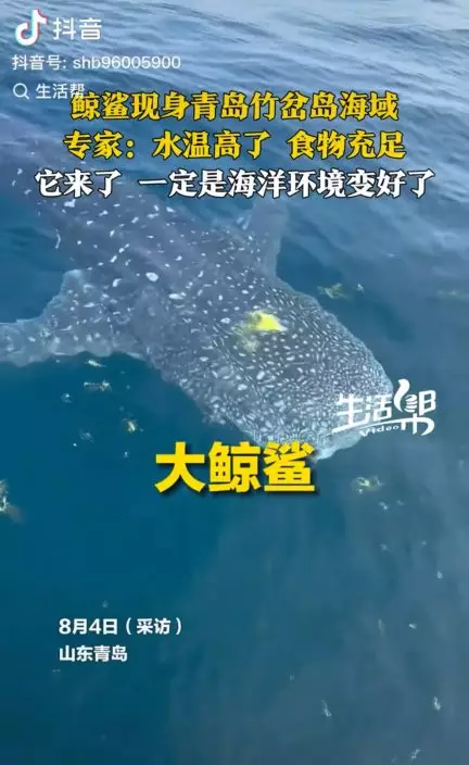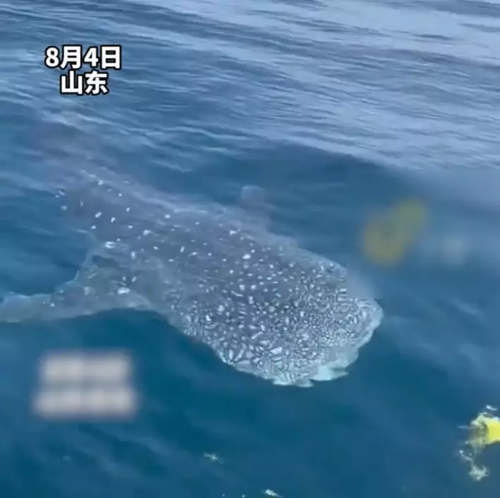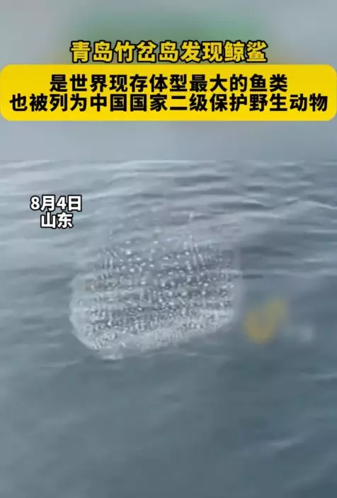 綜合內媒報導,內地一名釣魚愛好者李耀峰8月4日上午與友人一同乘船前往青島海域竹岔島準備海釣。在等待期間,海面上突然出現一隻「龐然大物」,眾人見狀均被嚇了一跳,細看才發現竟是一條全身佈滿星星斑點的絕美「鯨鯊」,而且距離水面極近,船上眾人隨即掏出手機記錄這難得一見的景象。