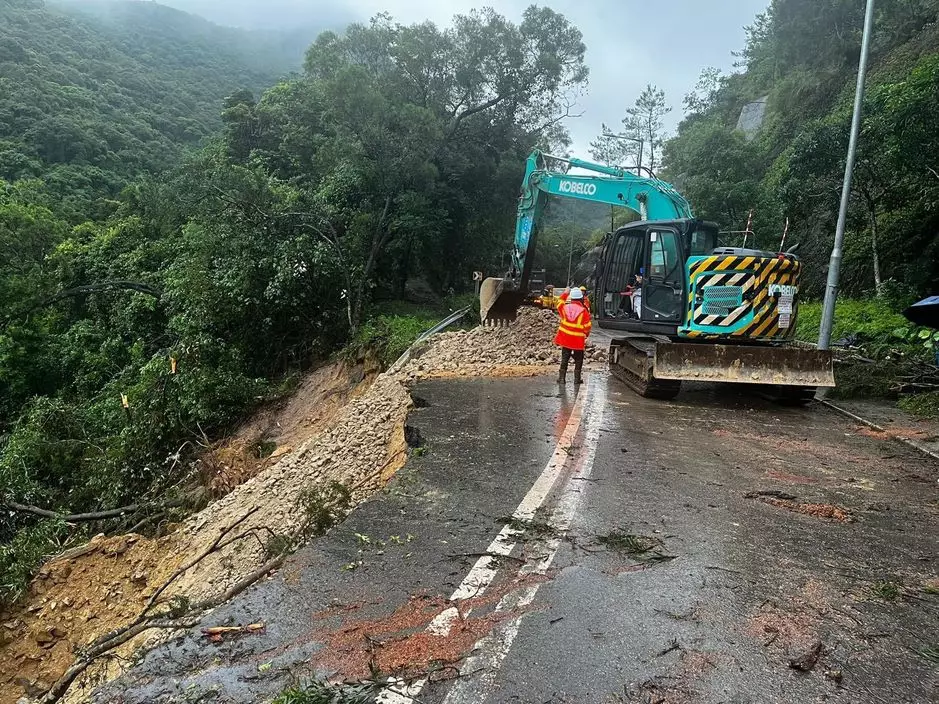 受山泥傾瀉影響,大埔新娘潭路近涌背一段路現時全線封閉, 路政署正進行緊急斜坡及路面修復工程。