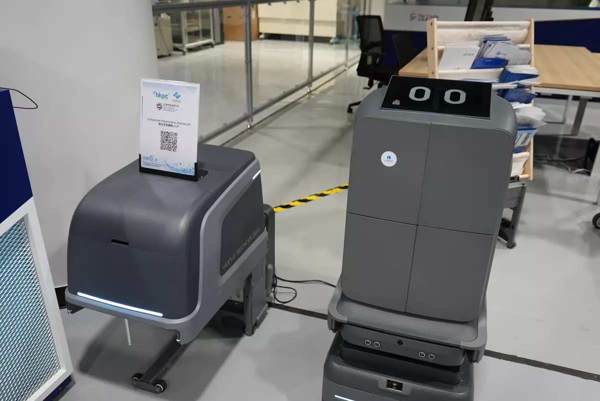 「出海服務中心」展示雲迹科技研發的複合多態機器人"UP",處於測試階段。生產力局表示會進一步支持企業,利用香港金融及專業服務優勢,幫助拓展海外市場。(巴士的報記者攝)