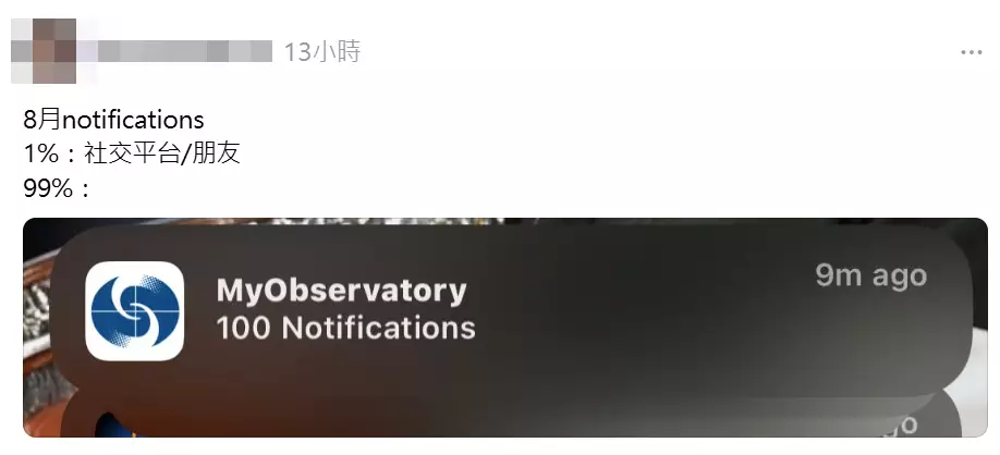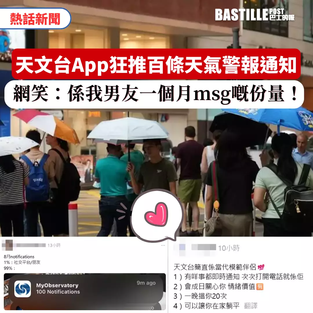 本港在過去的一星期內經歷了幾次黑色暴雨,天文台不時會透過手機應用程式發出即時訊息,讓市民可以掌握最新天氣情況。但有不少網友反映星期二(8月5日)收到天文台海量訊息,有人甚至在短時間內收到70至100則通知,數量驚人,笑稱「多過男朋友搵自己」!
