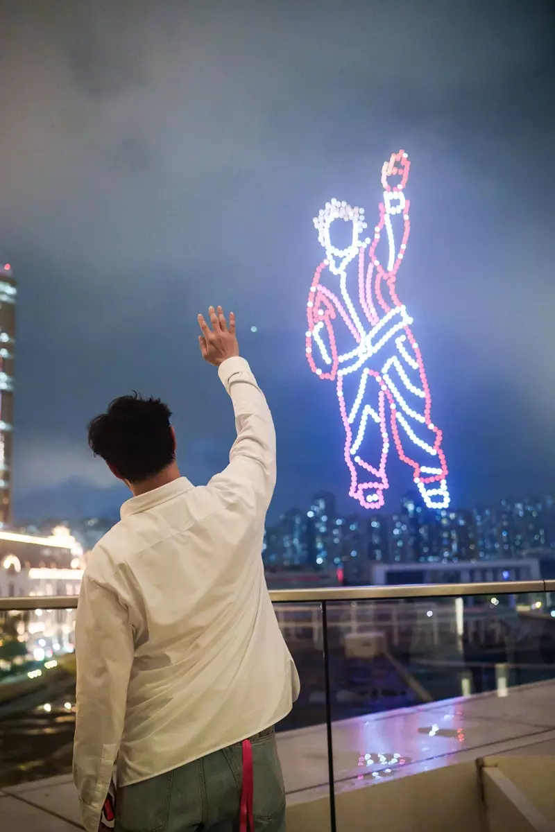 散會時,觀眾不肯離開,寵粉無上限的他!即席清唱了幾句《明年今日》給大家聽,讓觀眾開心不矣。而緊接之後,大會亦安排了1500部無人機,於首映場館外表演,現場以Eason的經典金曲,配合無人機砌出各種他的演唱會造型,非常精彩,讓大家看得十分開心,滿載而歸。
