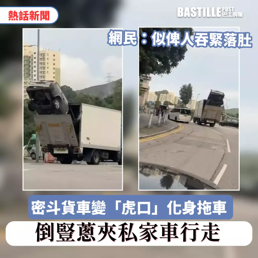 近日,網上流傳一段影片,一輛貨車以尾板半開的形式,「口夾」着一輛私家車在馬路上行駛,私家車近半車身露出貨車外,如同遭「虎口」吞噬,隨時有跌出路面的危險,險象環生。