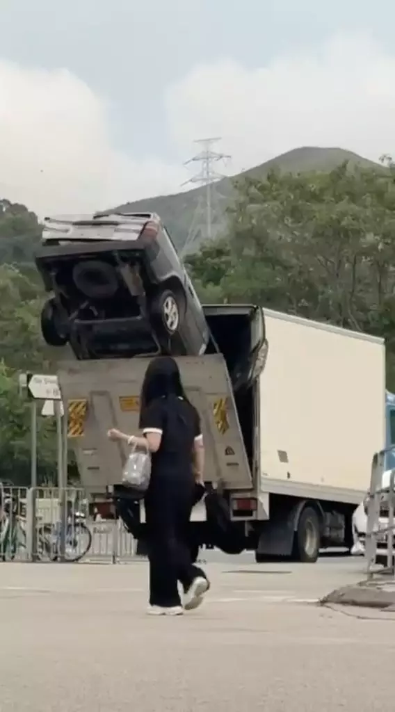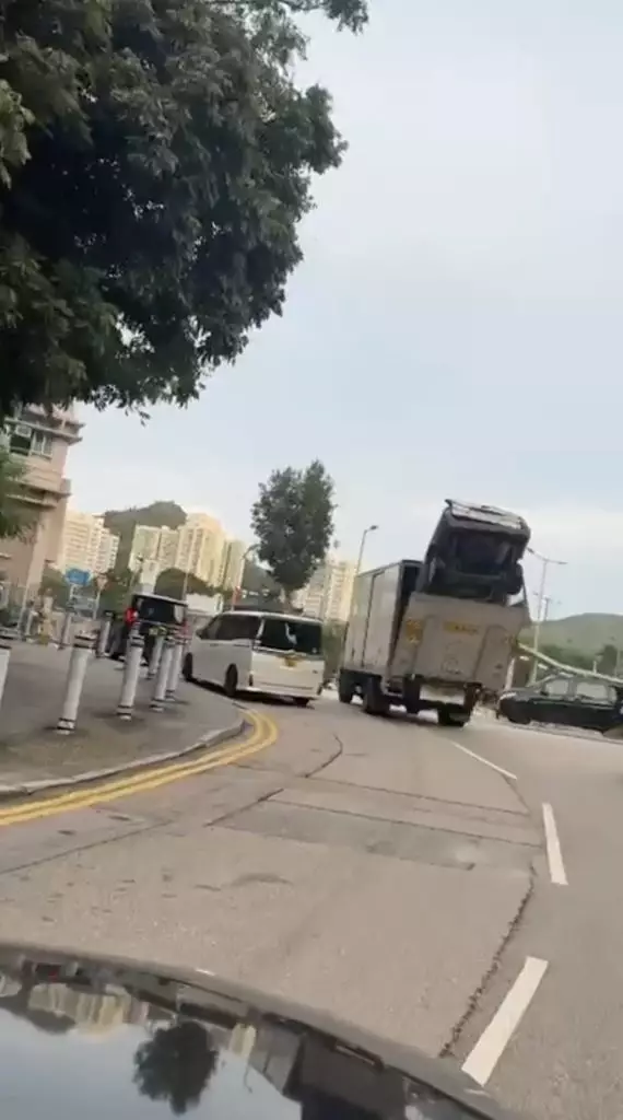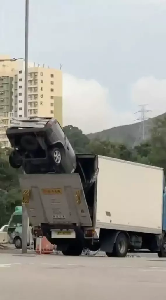 據網友分析,事發於元朗小商路,片中的涉事貨車尾板半開,裝載一輛私家車。而私家車「倒豎蔥」式被尾板夾住,後半車身露出貨車外,在路上驚險行走。