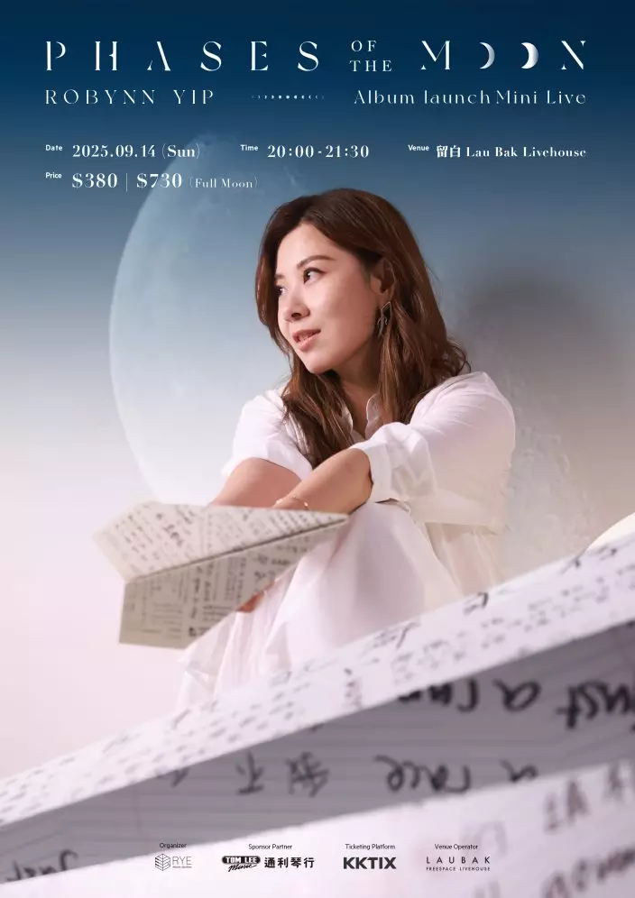 Robynn Yip(葉中月)經過5年獨立歌手的歷煉,把這段時光的作品,匯集一共11首歌曲,完成心願推出首張療癒系個人大碟《Phases of the Moon》,將在9月份推出1000張限量版黑膠唱片發售,更落實9月14日於西九文化區之留白Live House 舉行新碟發佈迷你演唱會,與樂迷近距離以音樂共聚。專輯內包括她為衛蘭作曲的《呼吸之間》英文demo版《Breathe》,以及為李幸倪作曲的《單戀這件小事》demo版《New Me》,加上這5年的音樂作品。