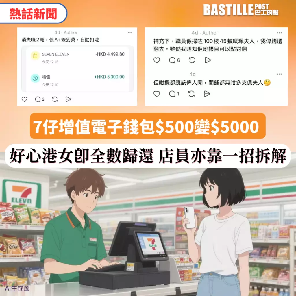 工作上出錯難免,涉及金錢時,處理更需謹慎。香港近日就有一宗好人好事引發關注,一名港女在社交平台分享,指自己早前到7-Eleven為電子錢包增值時,店員因大意將本應增值的500元誤入錯為5000元,面對這筆「飛來橫財」,事主即時誠實應對,折返店舖歸還多給的4500元,以免店員需自己承擔公司損失。