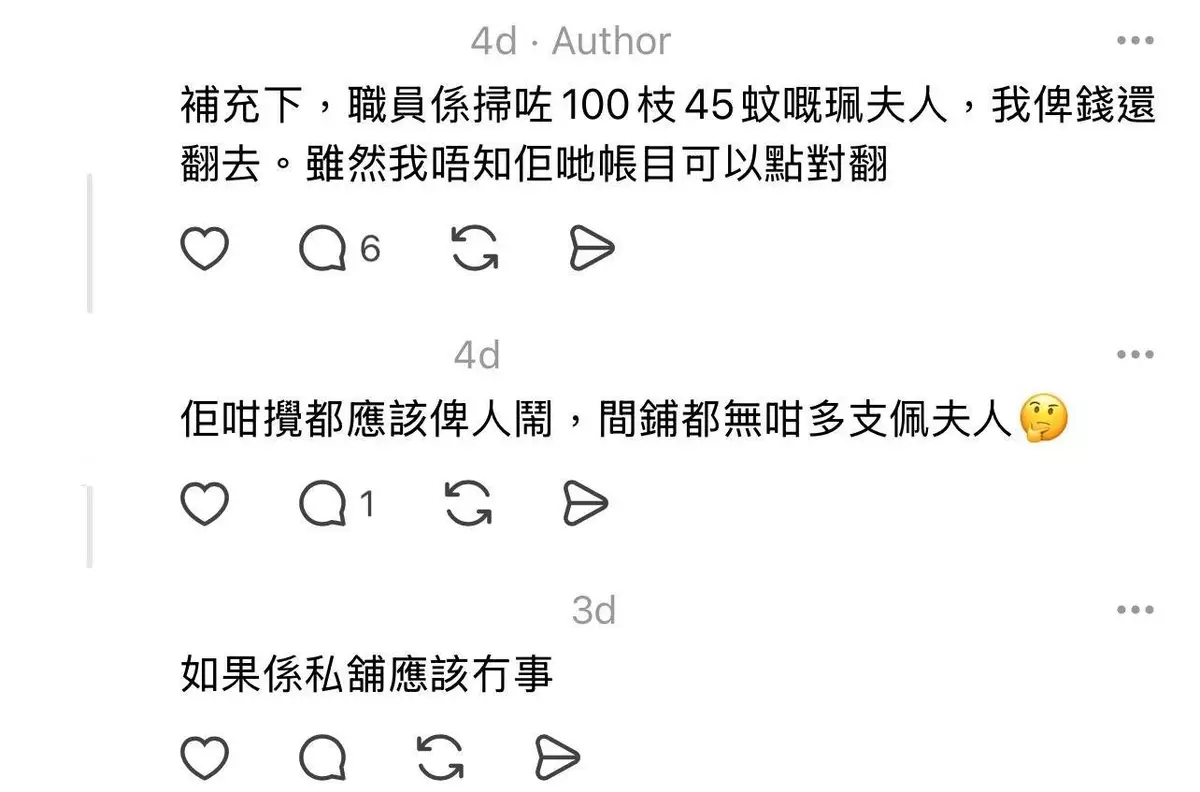亦有人分享類似的慘況「以前份工有同事收少左錢,個客有留電話,打返比佢話收少左錢希望佢黎補返,個客無返黎,同事要全數賠返」、「試過多咗4蚊,我去還返,但個收銀好似唔care 咁」、亦有人坦言「細個果時確係貪呢d,人大左出左個社會,見識到原來人性醜惡到你可以去到一個憤怒點,意識到世界係應該要末日,就開始連收少1蚊都會提個收銀,食完野就執好碗碟方便個侍應收,已經唔介意自已無橫財」。