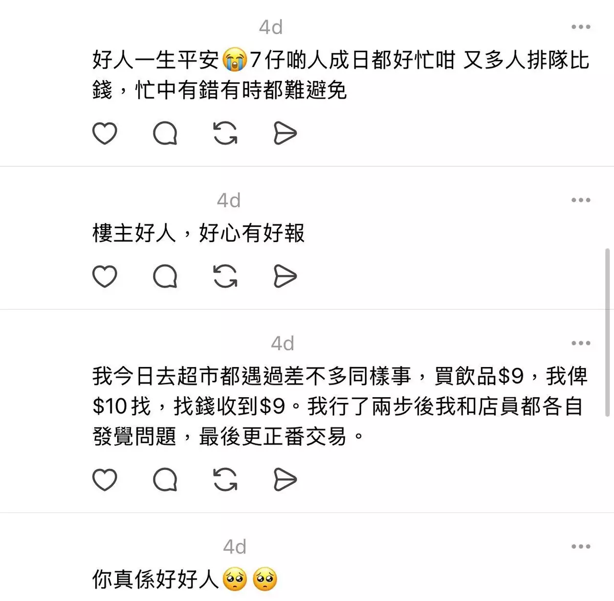 這件事令事主笑言「可以講一世」,帖文亦引來大批網民熱議。有網民稱讚:「好少好似你咁好」、「好人一生平安」、「好人一生平安,7仔啲人成日都好忙咁,又多人排隊比錢,忙中有錯有時都難避免」等。