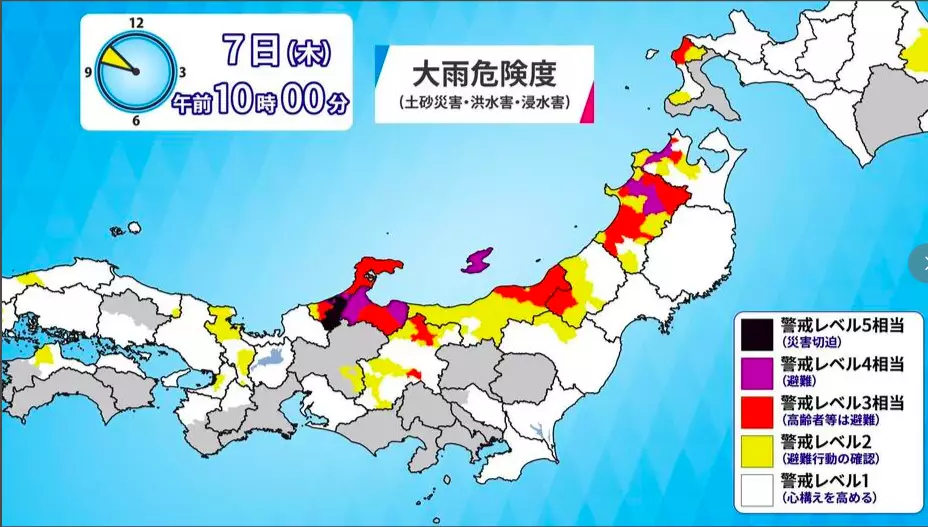 青森、秋田、新潟、富山以及石川縣發生山泥傾瀉風險顯著上升。這些縣部分地區已發出山泥傾瀉警報。