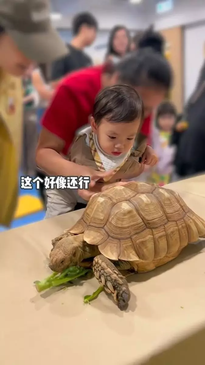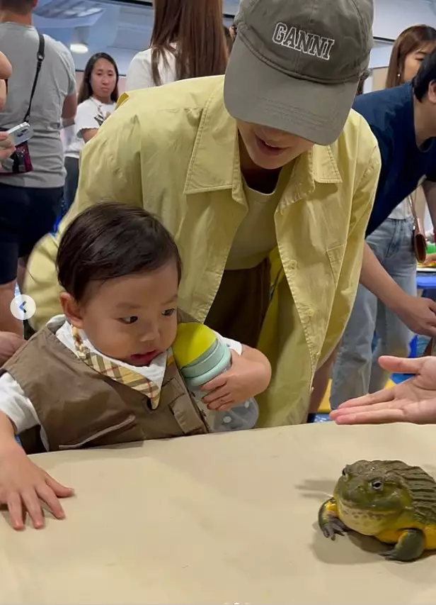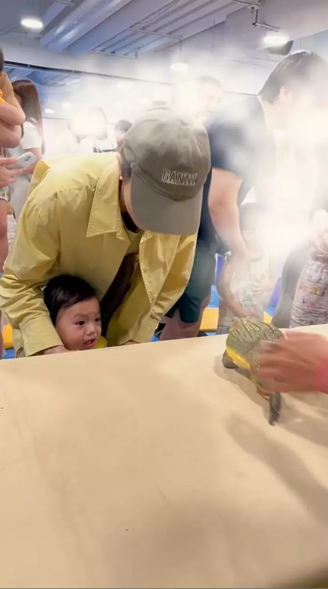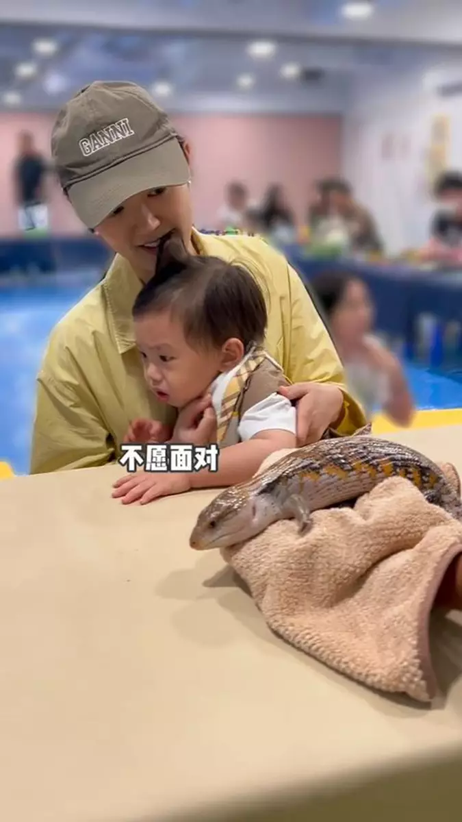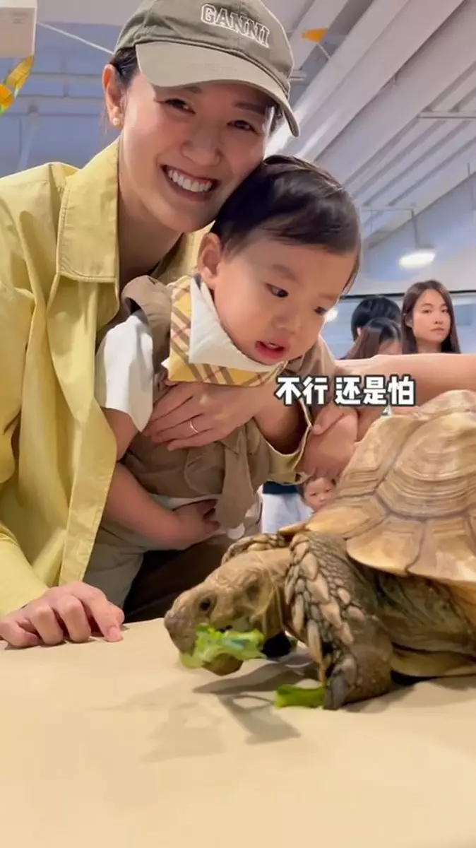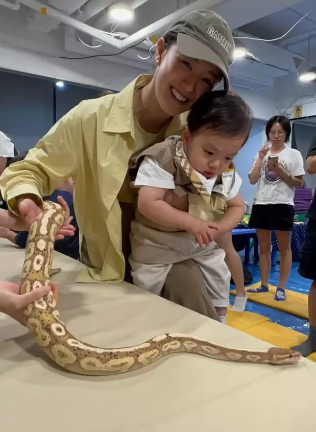 張寶兒在社交平台分享影片和照,可見她帶囝囝近距離接觸青蛙、蛇、蜥蜴、烏龜等,但袁咕碌全程驚恐樣,一直抱緊自己的奶樽,不停躲避,甚至想躲到枱下,只有烏龜不太抗拒,但合照時依然是「強顏歡笑」,相反張寶兒就十分大膽伸手去摸,還笑得好開心,張寶兒還扮囝囝留言:「袁咕碌:有沒有人能管管我媽」、「只有媽媽開心,我跟他們真的不熟」,非常搞笑!