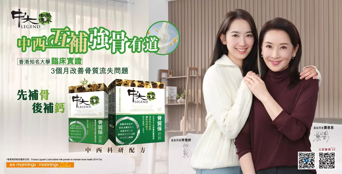 近年活躍於影視圈的龔慈恩(龔姐)與女兒新生代演員兼唱作歌手林愷鈴(Ashley)正式宣布成為「中大中藥傳承」品牌代言人。首輪播出骨質保系列(骨質保膠囊及骨質保奶粉)廣告,兩人首次以「母女檔」形式跨界健康領域合作,展現跨世代健康傳承理念。