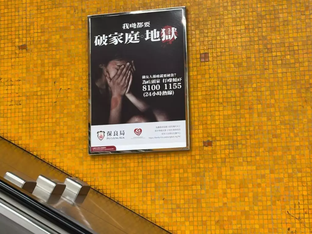 7月觀塘綫及荃灣綫等多條港鐵綫路都可以見到標題為「我哋都要破家庭.地獄」的海報,在疑似被虐打的女性旁邊有保良局的24小時熱線號碼,呼籲受家暴問題困擾的女性,以及目睹家暴的第三方(例如鄰居、朋友)或施虐者及早向外求助。