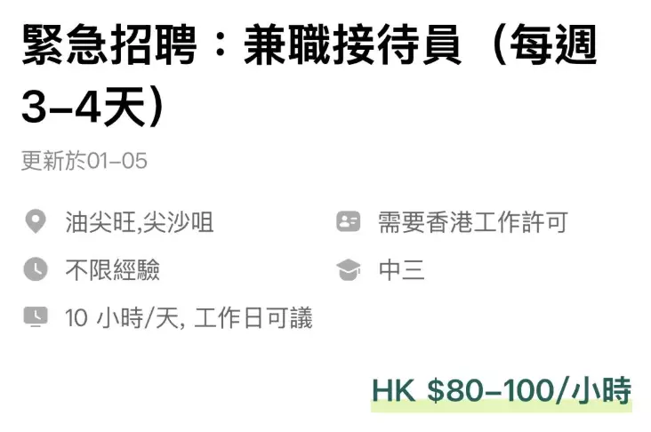 相關招聘廣告連結已失效,頁面顯示「未能找到該職位」。根據女事主當時的求職廣告截圖,可以見到該兼職接待員工作,時薪高達$80至$100,只需中三程度、不限經驗,更有加班津貼和生日假等福利。