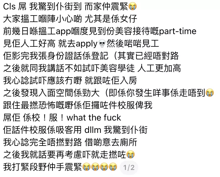 事緣該少女被美容院接待員高達80至100的時薪吸引應徵。沒想到,到場後卻被利誘轉做時薪$188的「美容學徒」,更被帶入一間「勁大、走唔到」的房間,職員其後取出校服要求更換,聲稱是「吸客用」。事主借故逃離後驚魂未定,直言「Cls,X,我驚到仆街到,而家仲震緊」,事後已到警署備案。