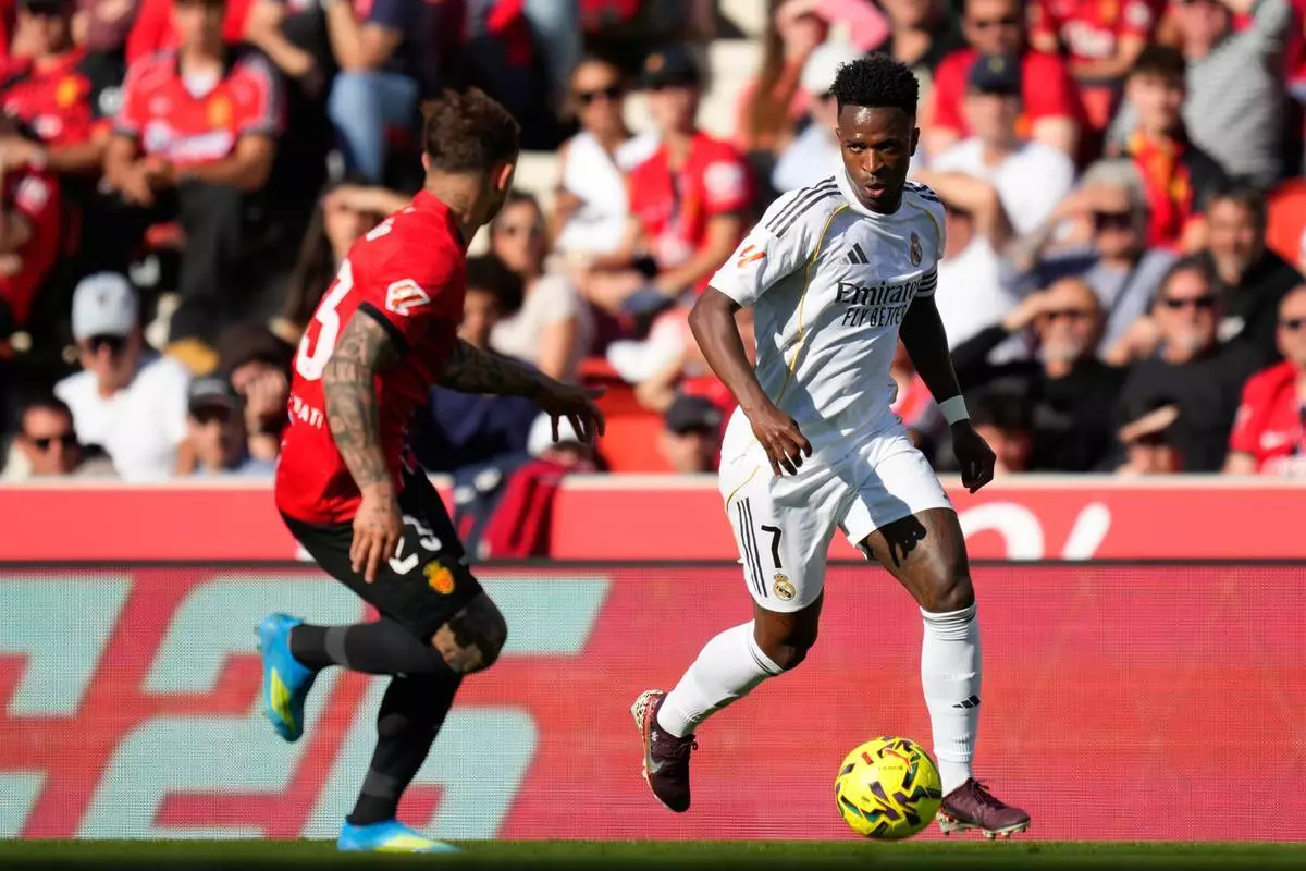 皇家馬德里球員Vinícius2026年4月4日周六,於西班牙馬略卡帕爾馬舉行的西甲足球賽事中,對陣馬略卡與皇家馬德里期間,在馬略卡球員柏保路馬菲奧(Pablo Maffeo)面前的動作。(美聯社圖片/Jose Breton) AP圖片