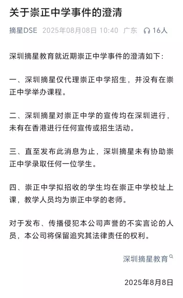聲明又說,有關宣傳均在深圳進行,並未有香港進行任何宣傳或招生活動。至今深圳摘星未有協助崇正中學錄取任何一名學生。