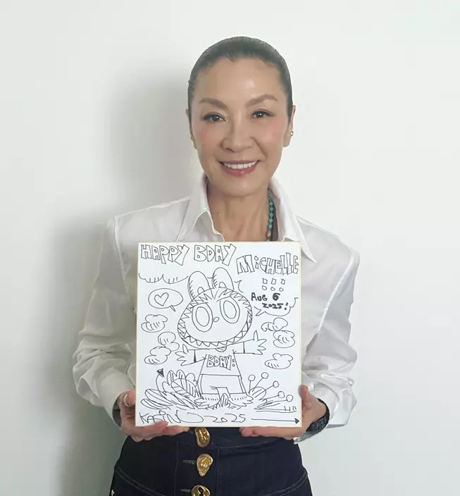除了巨型蛋糕,楊紫瓊還收到Labubu創作者龍家昇親手繪製的生日卡。卡片上畫著穿有「BDAY」上衣的Labubu公仔,並親筆寫上「HAPPY BDAY MICHELLE」,非常有心思!楊紫瓊開心地分享這張生日卡,並感謝龍家昇的畫作,直言「希望我們盡快有一天能見面!」可見她早已成為Labubu的頭號粉絲!