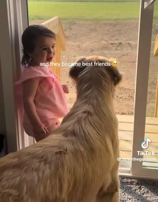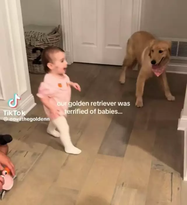 日前,國外一名飼主「@novathegoldenn」在TikTok上分享了黃金獵犬「諾娃」(Nova)與來家中作客的人類小妹妹的可愛互動畫面。飼主介紹,諾娃起初對小妹妹充滿戒心,每次見到對方便不斷後退,努力與對方保持距離,直至後來逐漸適應對方的存在,才慢慢放下戒備。