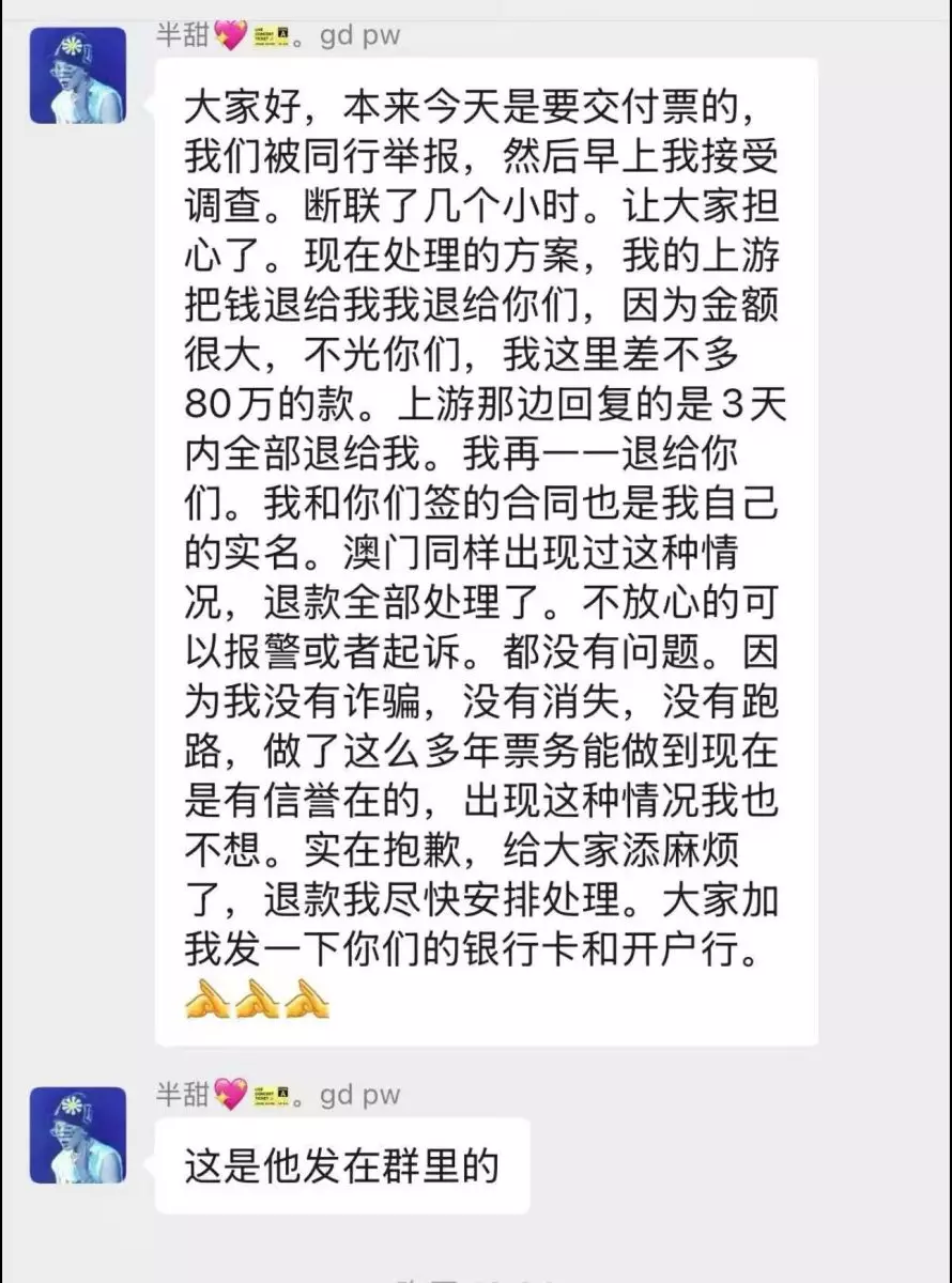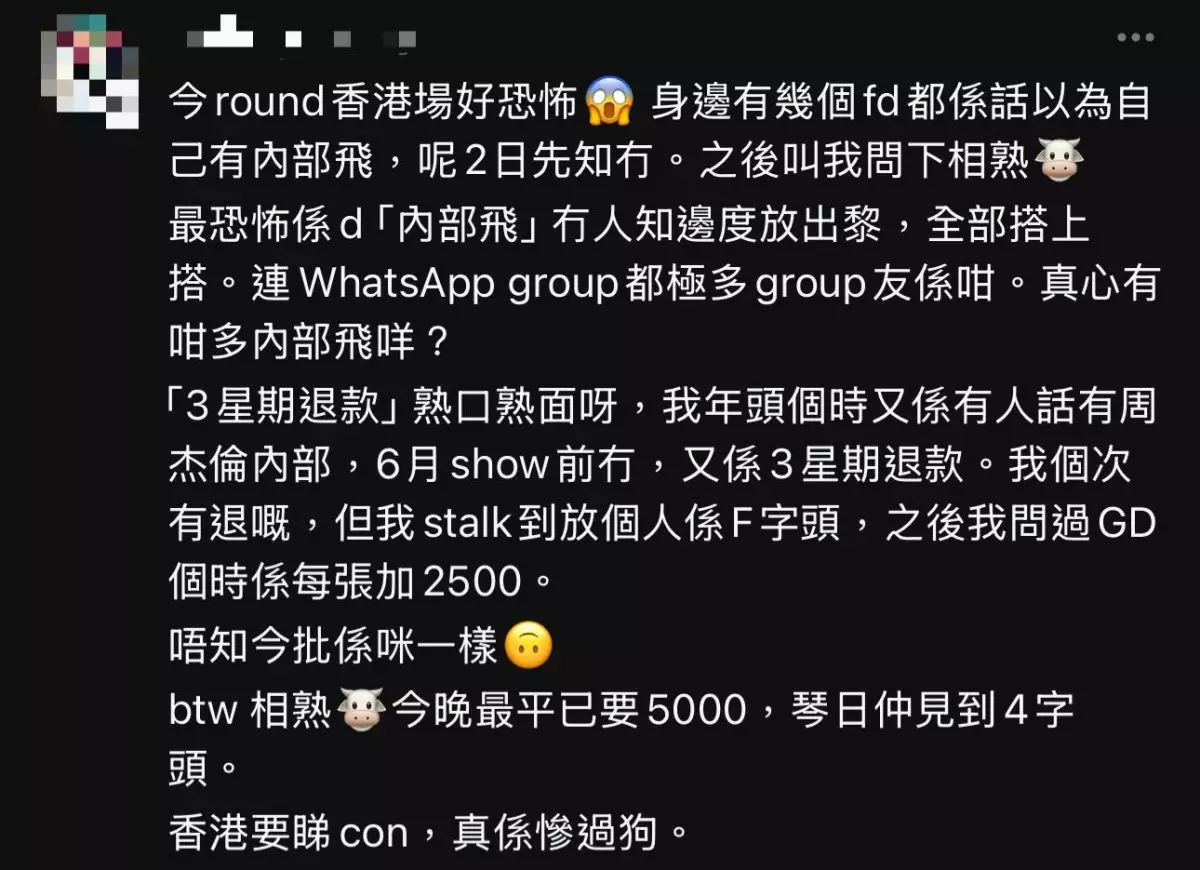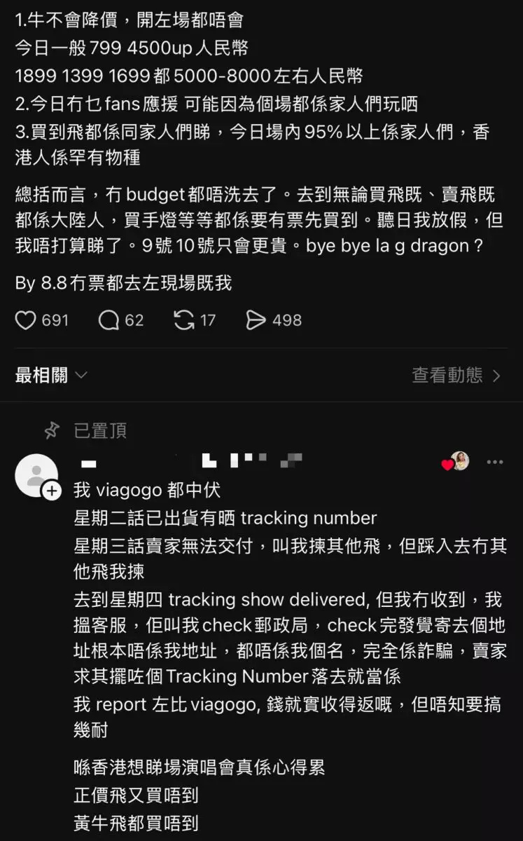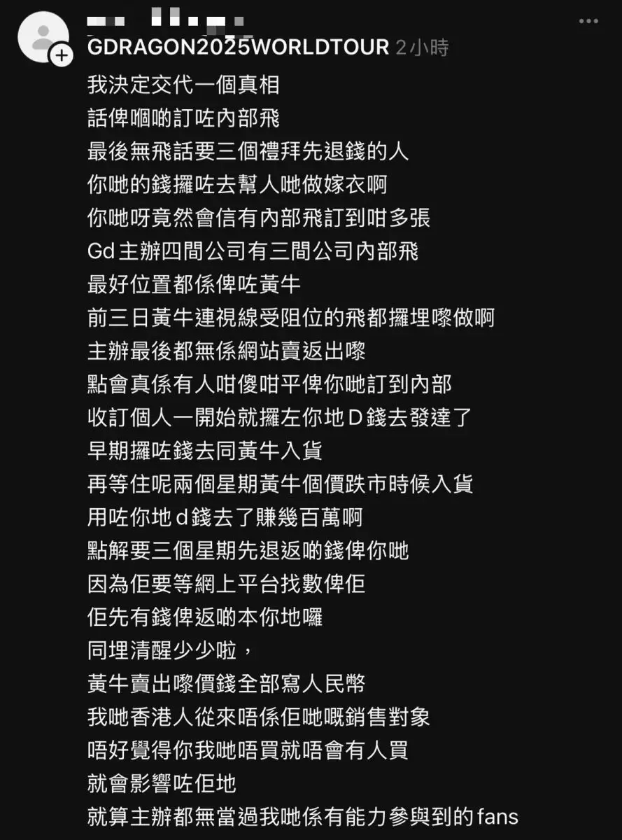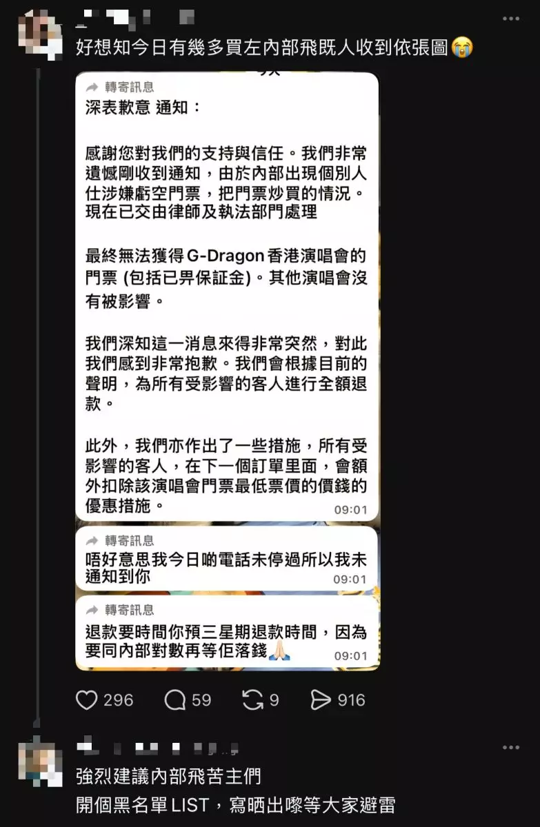 不少粉絲日前在Threads等社交平台上訴苦,表示不僅見不到偶像,連金錢也可能血本無歸。有粉絲無奈寫道:「本來找了朋友介紹的內部票,怎料臨時才說沒票,已經買了很多應援物資,現在很徬徨」、「沒想過這張圖會成為一眾人的惡夢,開演前才說沒票,好失落」更有粉絲呼籲:「強烈建議公開黑名單,讓大家避雷」而退款流程亦讓粉絲憂心。黃牛聲稱需「逐一核對內部帳目」,退款需時約三星期,部分粉絲為保障權益,已選擇報警。粉絲感嘆:「比起擔心退款,看不到GD才是最難受」。
