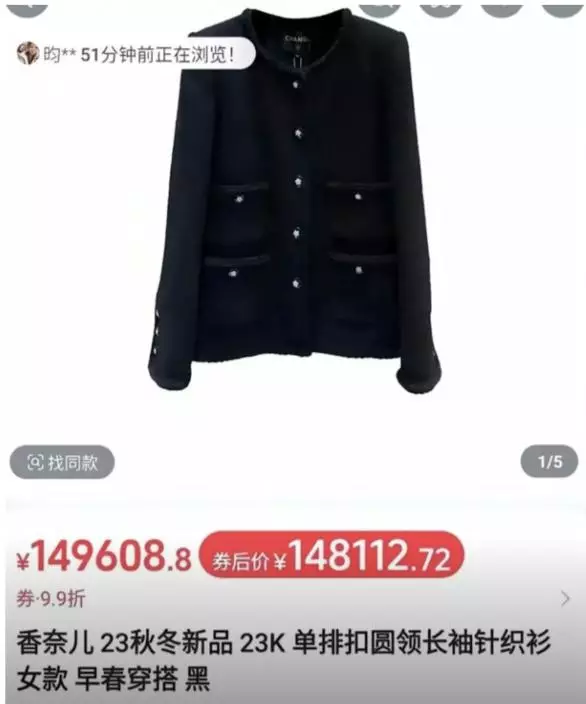 在被媒體拍到時,她帶著口罩帽,身穿的黑色上衣是CHANEL,售價近15萬元人民幣(約16.4萬港幣)。網絡圖片