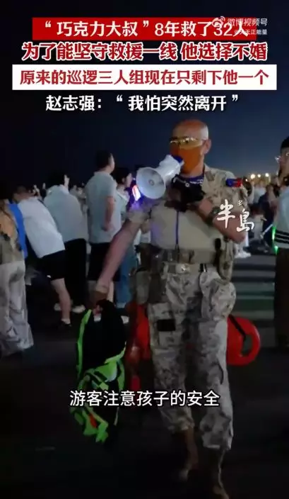 綜合內媒報導,青島五四廣場有一名被市民親切稱為「巧克力大叔」的56歲退伍老兵趙志強,正與往常一樣義務在海岸邊巡邏守護遊客居民。自2017年擔任社區樓長以來,他從未間斷巡邏,每日手持大聲公在五四廣場一邊又一遍提醒遊客「注意安全」。