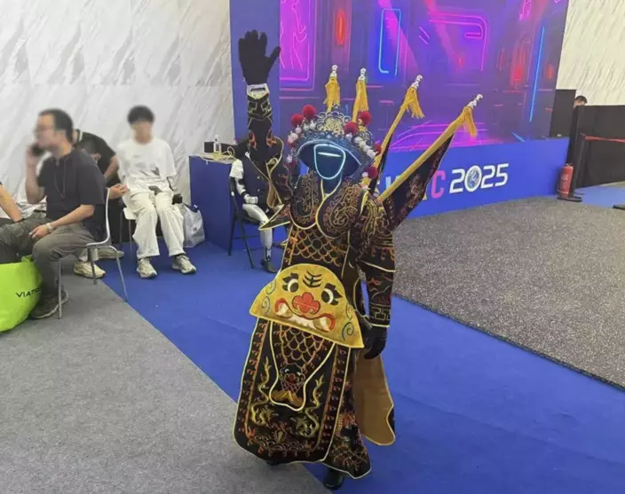 京劇扮相的宇樹科技機器人在展館外對觀眾揮手互動。網上圖片