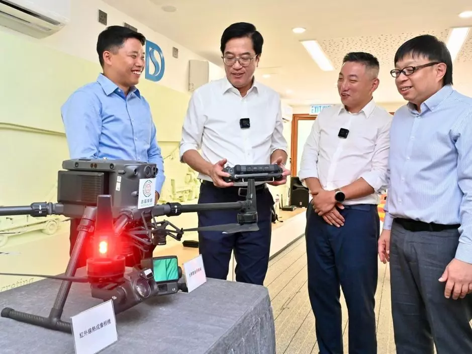 黃偉綸(左二)了解無人機的技術突破和操作。政府新聞網