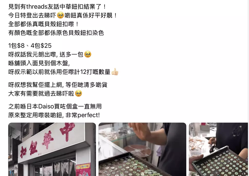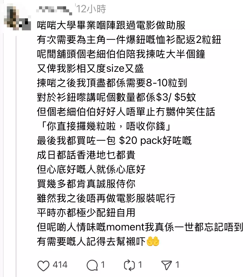 其中一位網民分享了她與「中華鈕扣」的溫馨回憶最令人動容。她憶述大學畢業後曾任電影助服,某次需為主角爆鈕的恤衫配回兩粒鈕扣,便走進這家店。老闆不但耐心陪她挑選逾半小時,亦毫不介意她拍照、量度尺寸。最終所需鈕扣不過八至十粒,價值僅數元,但老闆笑著說:「你直接攞幾粒啦,唔收你錢」。她感動地表示:「呢啲moment我真係一世都唔會忘記」。