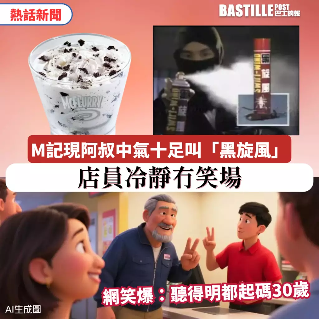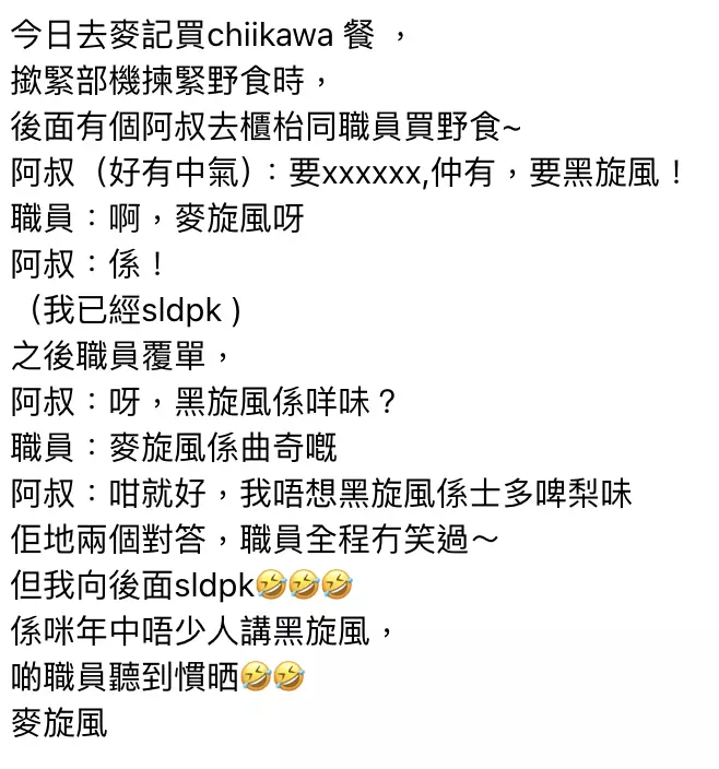 近日有港女在社交平台分享,指自己在M記自助點餐機點餐時,聽到身後一位大叔在櫃檯點餐時說:「仲有,要黑旋風!」此話一出,讓事主忍俊不禁。