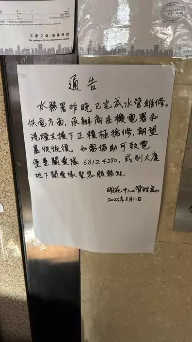 北角明園西街後巷地面星期日(8月10日)傍晚出現湧水,多幢大廈一度暫停食水供應,明苑中心的電錶房運作受影響,導致大廈停電,至今未恢復。大廈低層用戶的供水已恢復正常,但高層供水未恢復,水務署在大廈外安排水車,港燈公司職員在場處理。大廈地下的食肆、超級市場和便利店因停電未有營業。