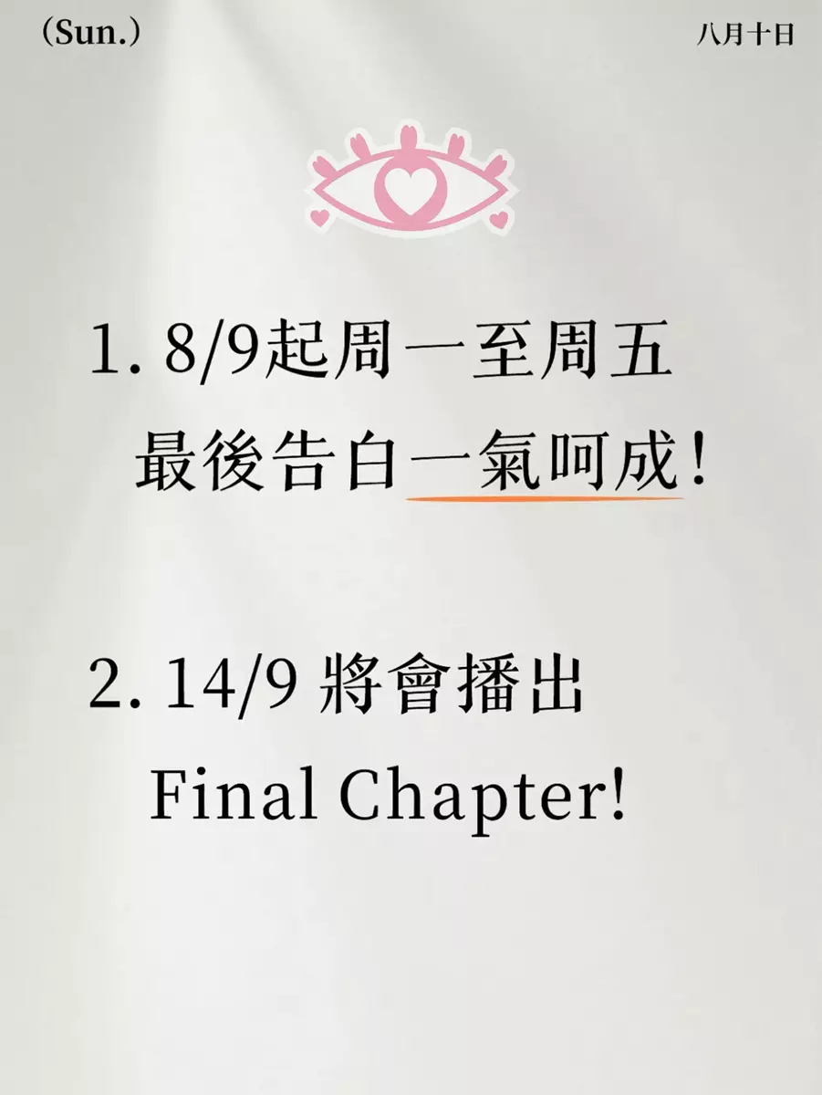 此外,官方今日(8月11日)公布《女神配對計劃》節目新編排,8月24日播畢第十二集後將暫停播映兩星期,並將由9月8日起,推出結局篇《女神配對計劃 最後告白》,周一至周五晚十點半播出第十三至第十七集、並於周日(14日)晚翡翠台播出最後一集,敬請留意!