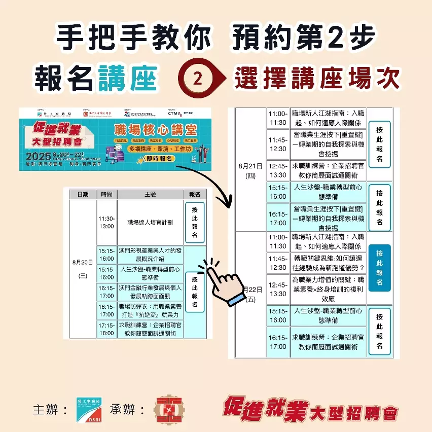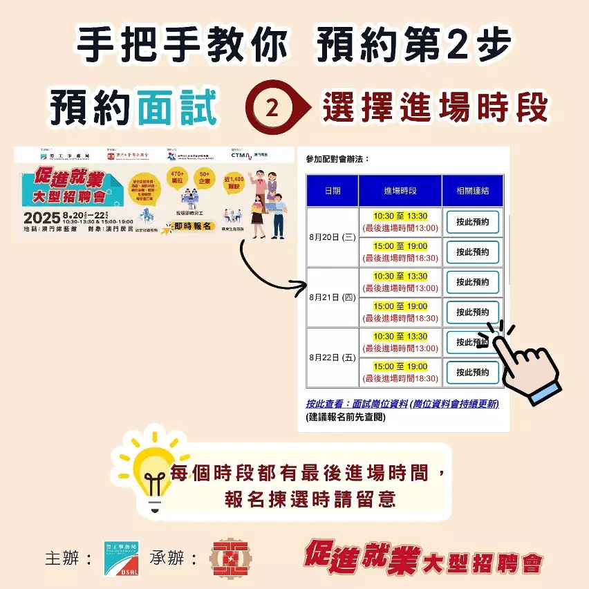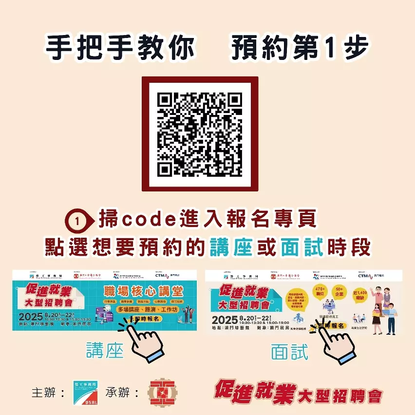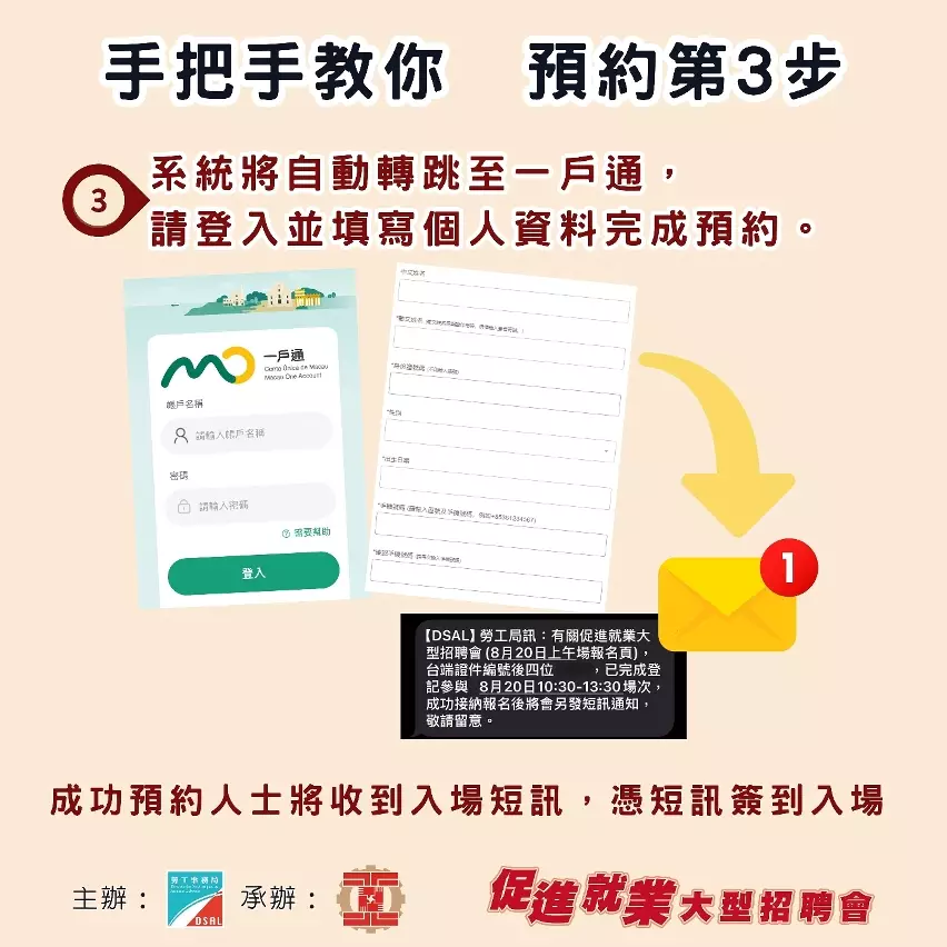 成功報名的澳門居民將收到確認短訊,屆時憑短訊簽到進場參與相關活動。活動設即場就業配對及應徵面試,參加者請帶備澳門居民身份證及個人履歷等面試所需文件,並穿著合適衣著前往現場。