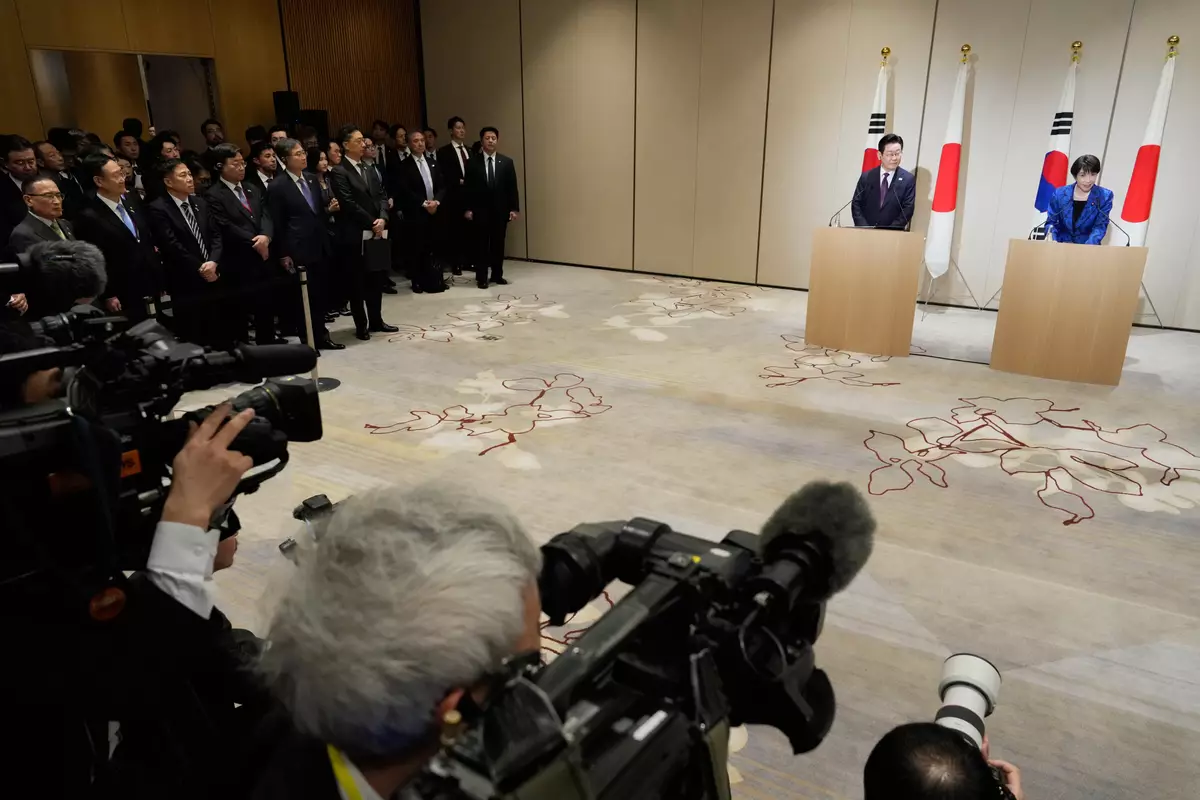 蘇林(左)和李在明(右)一同見記者。AP圖片