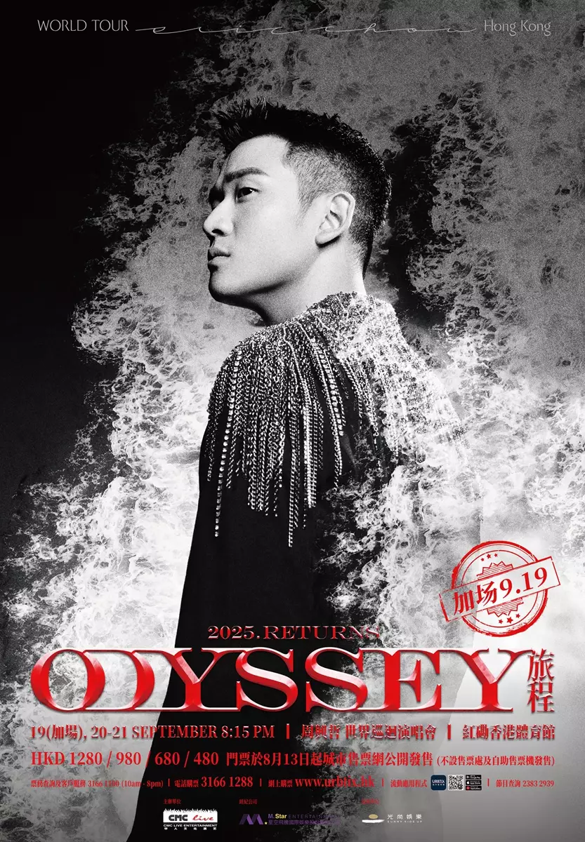 早前富邦銀行的優先訂票,火速售罄。日前在黑色暴雨警告下,門票正式公開發售,惡劣天氣無減歌迷熱情,兩場《周興哲Odyssey World Tour2025 Returns–Hong Kong演唱會》門票再次被秒殺售罄。今天主辦方宣佈加場喜訊,決定於9月19日加開一場,感謝樂迷的熱切期待及支持。門票價錢為港幣$1280 / $980 / $680 / $480, 於2025年8月13日早上10時正起於城市電腦售票網 公開發售。