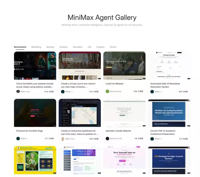 為了建立一個活躍的創作者生態,MiniMax 近期推出了Marketplace,這是一個讓 AI Agent 得以被公開分享、發現和重覆利用的市集。當原創作者的專案被他人 Remix 時,原作者將能獲得 Credits 獎勵,實現知識變現。此外,新增的 Gallery 創作廣場則為創作者提供了一個展示作品、交流靈感的平台,並能連結至創作者的個人社群媒體,增加曝光機會。