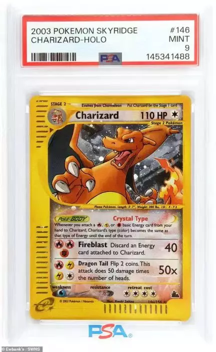 布朗德原以為整套卡牌價值約500英鎊(約5263港元),朋友一看後發現,其中三張為2000年代初期的稀有卡牌,更是拍賣會的熱門拍品。其中最值錢的為「Skyridge 噴火龍閃卡」,保存近乎全新,估價高達8000至1.2萬英鎊(約8.4萬港元至13萬港元)。其餘兩張同系列卡片,一張估價7000至1萬英鎊(約7.4萬港元至10.5萬港元),另一張反向閃卡也有1600至2200英鎊(約1.7萬港元至2.3萬港元)的行情,三張卡牌總價最高可達2.5萬英鎊(約26萬港元)。