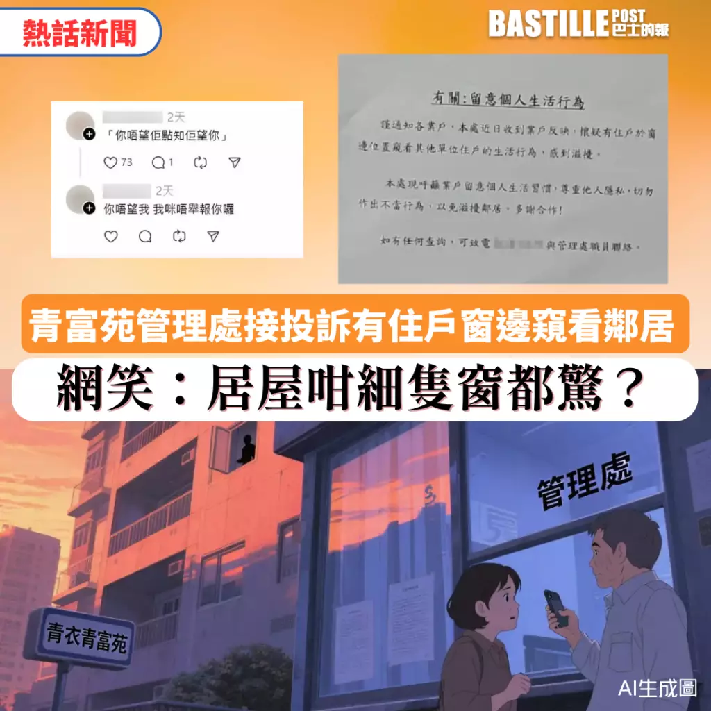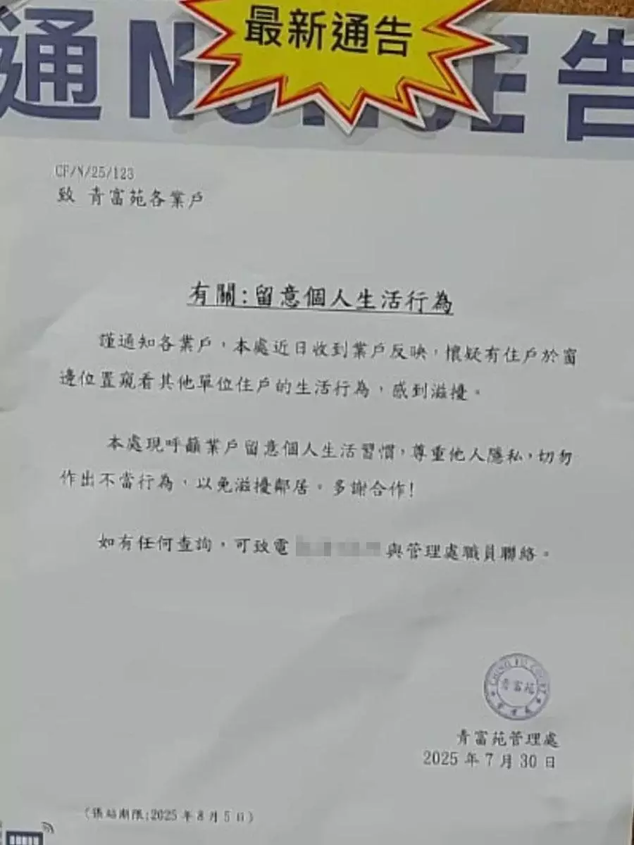 香港人口稠密,生活空間狹窄,不少住宅單位與鄰廈都只是近在咫尺。日前青衣一個屋苑向住戶發布通告,指近日收到業戶反映,懷疑有住戶透過窗口窺看其他單位住戶生活,呼籲停止不當行為,尊重他人私隱!