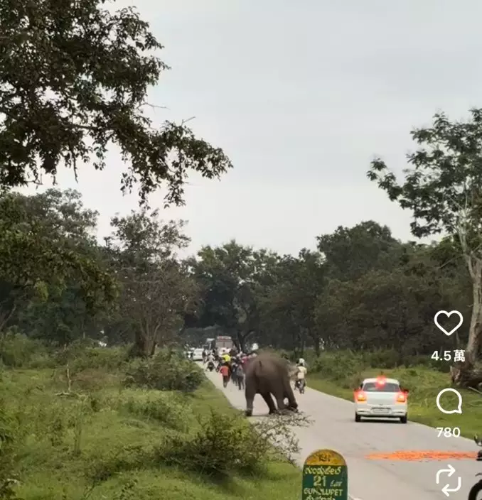 曝光片段顯示,當時野象正低頭享用從貨車掉落的紅蘿蔔,一名白衣男子違規下車舉機對準象頭拍照。突如其來的強光疑令象隻受驚,隨即加速衝過馬路直撲男子方向。路邊車輛與行人見狀立即停下讓行,而男子慌忙逃跑時意外跌倒,當場被象鼻壓制在地,險些遭到踩踏。