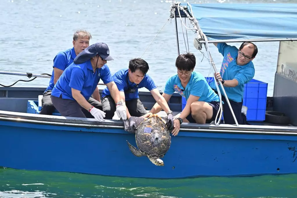 漁護署在香港南面水域將一隻玳瑁放歸大海,牠去年7月在長洲的南氹灣擱淺,被市民發現,其後由漁護署人員救起,經初步檢查後,被送往海洋公園,由獸醫進行詳細評估及持續觀察護理。