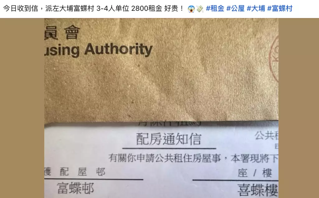 近日一名獲派大埔富蝶邨喜蝶樓3至4人單位的女住戶,在Facebook公屋交流群組發文,大嘆租金昂貴,引來網民起底揭背後真相。