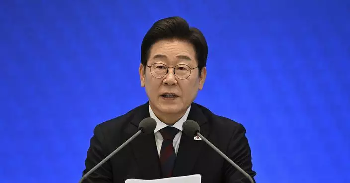 南韓總統李在明在風波一周年,於青瓦台迎賓館會見外國傳媒。AP圖片