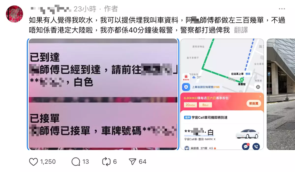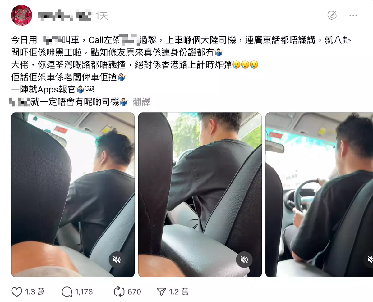 日前有網友在社交媒體發文,指自己在網上平台叫車,接載他的司機是「大陸」司機,稱連廣東話都不懂說,他於是「八卦」問他是否黑工啦,怎料司機承認自己連身份證都沒有。該名網民批評,司機連荃灣的路都不懂駕駛,絕對是香港路上計時炸彈。