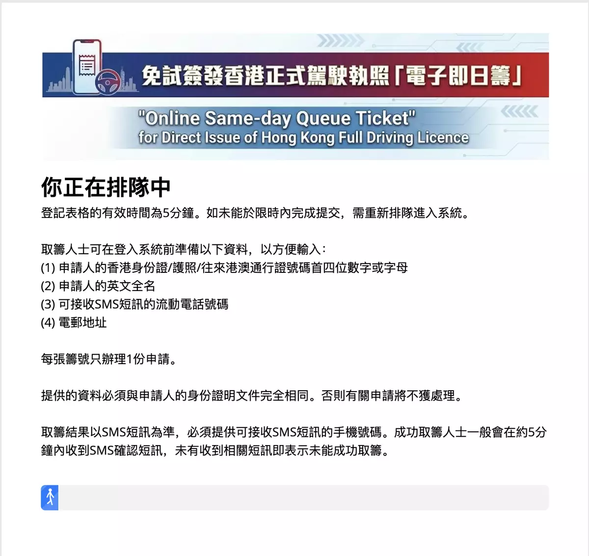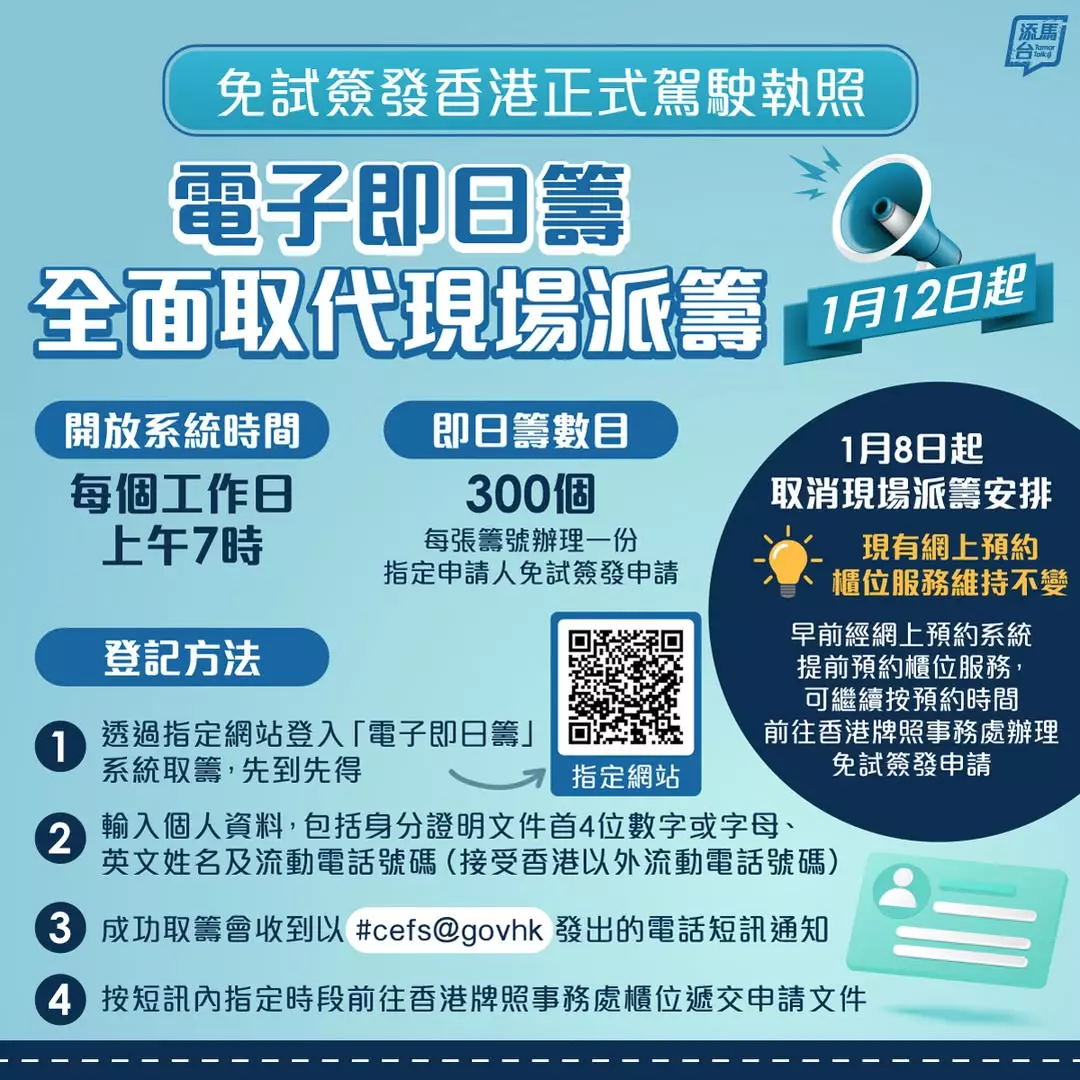 「免試簽發香港正式駕駛執照」申請人由本月12日必須經指定「電子即日籌」系統網上取籌。運輸署總行政主任盧偉君表示,新安排取代現場人士輪候即日籌的安排,每日有300個電子即日籌名額,推出以來運作大致暢順,正積極準備推出全面網上預約服務,稍後公布。她說,電子即日籌安排設有排隊系統,會有人機驗證功能,阻隔外掛程式。
