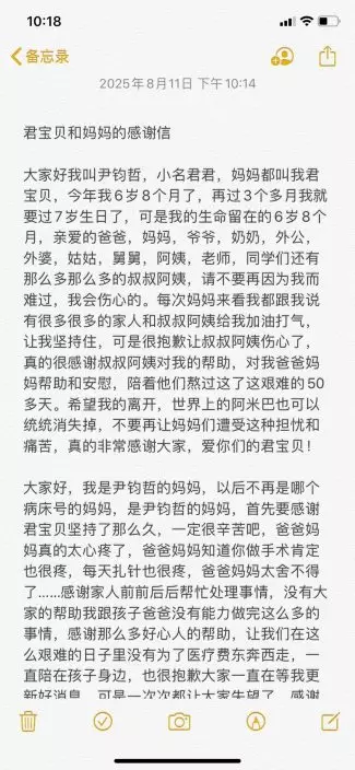 8月11日深夜,君君媽媽發表一封題為《君寶貝和媽媽的感謝信》,哀痛寫道:孩子「生命留在6歲8個月」,並向一路關心和幫助的社會各界表達感謝。